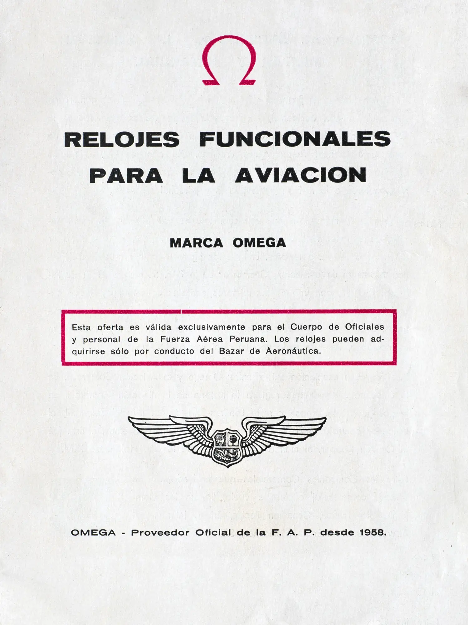 In 1958, OMEGA became the official supplier to the Fuerza Aérea del Perú. This partnership was communicated internally through the release of a commercial brochure featuring four OMEGA models: Seamaster 300, Speedmaster, Flightmaster, and Seamaster.
