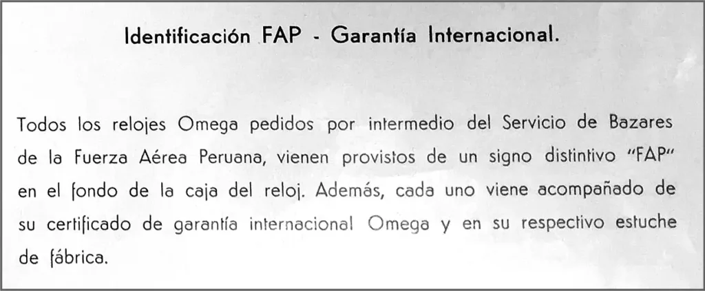 Sales were handled by the Peruvian OMEGA importer, Reiser & Curioni SA, which supplied the watches through the FAP stores, known as the “Bazar de Aeronáutica”. These purchases also benefited from preferentials prices and an extended warranty – two years instead of the standard one.