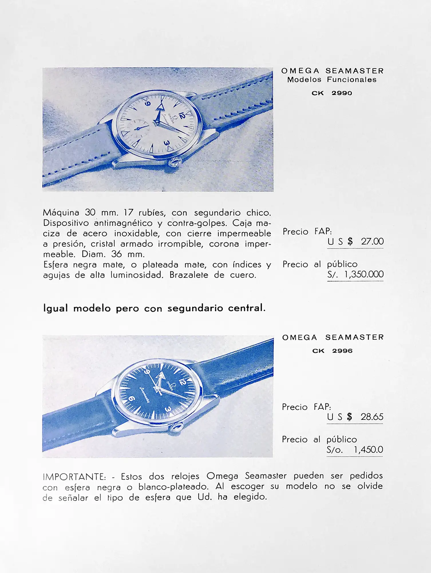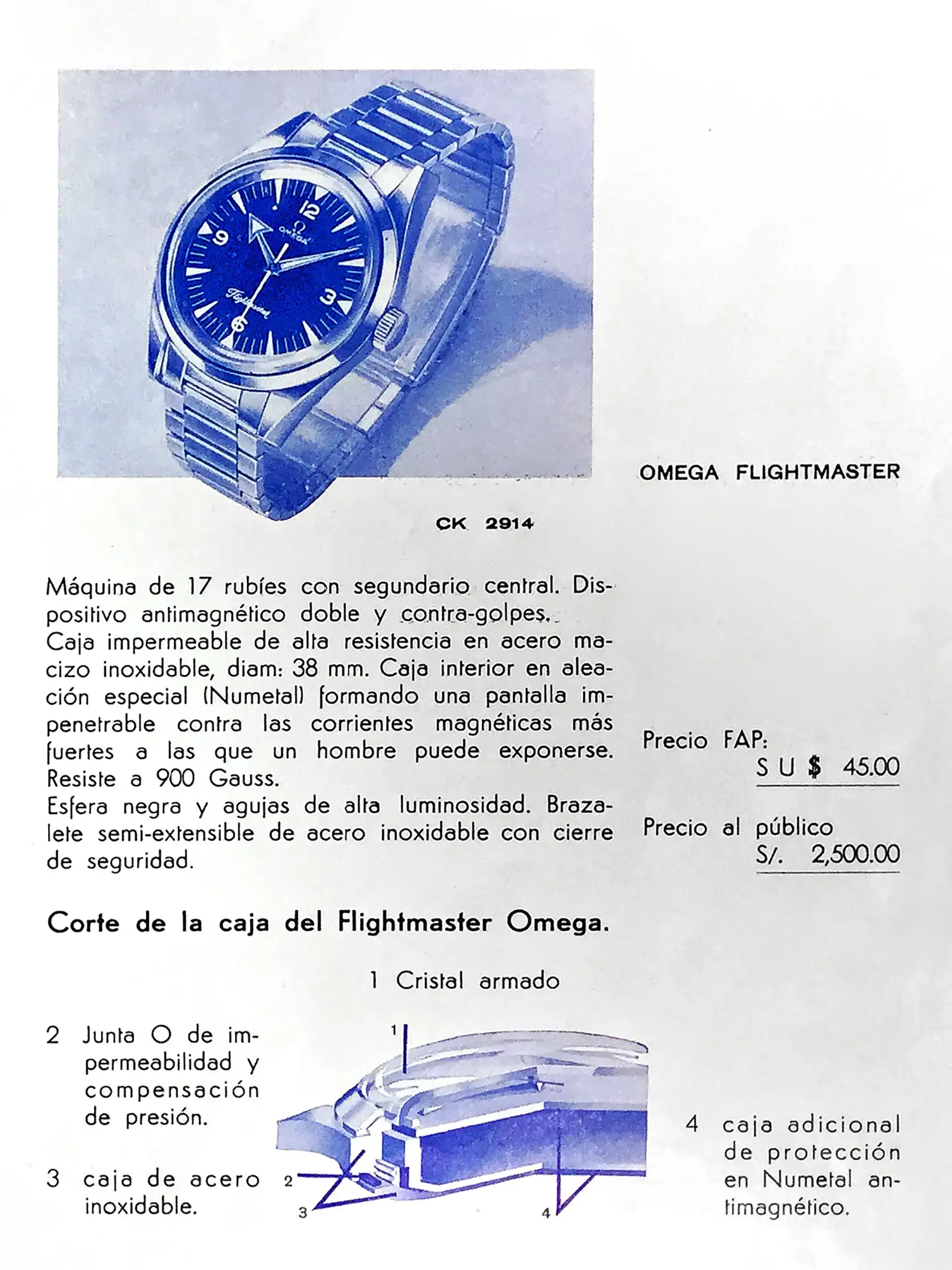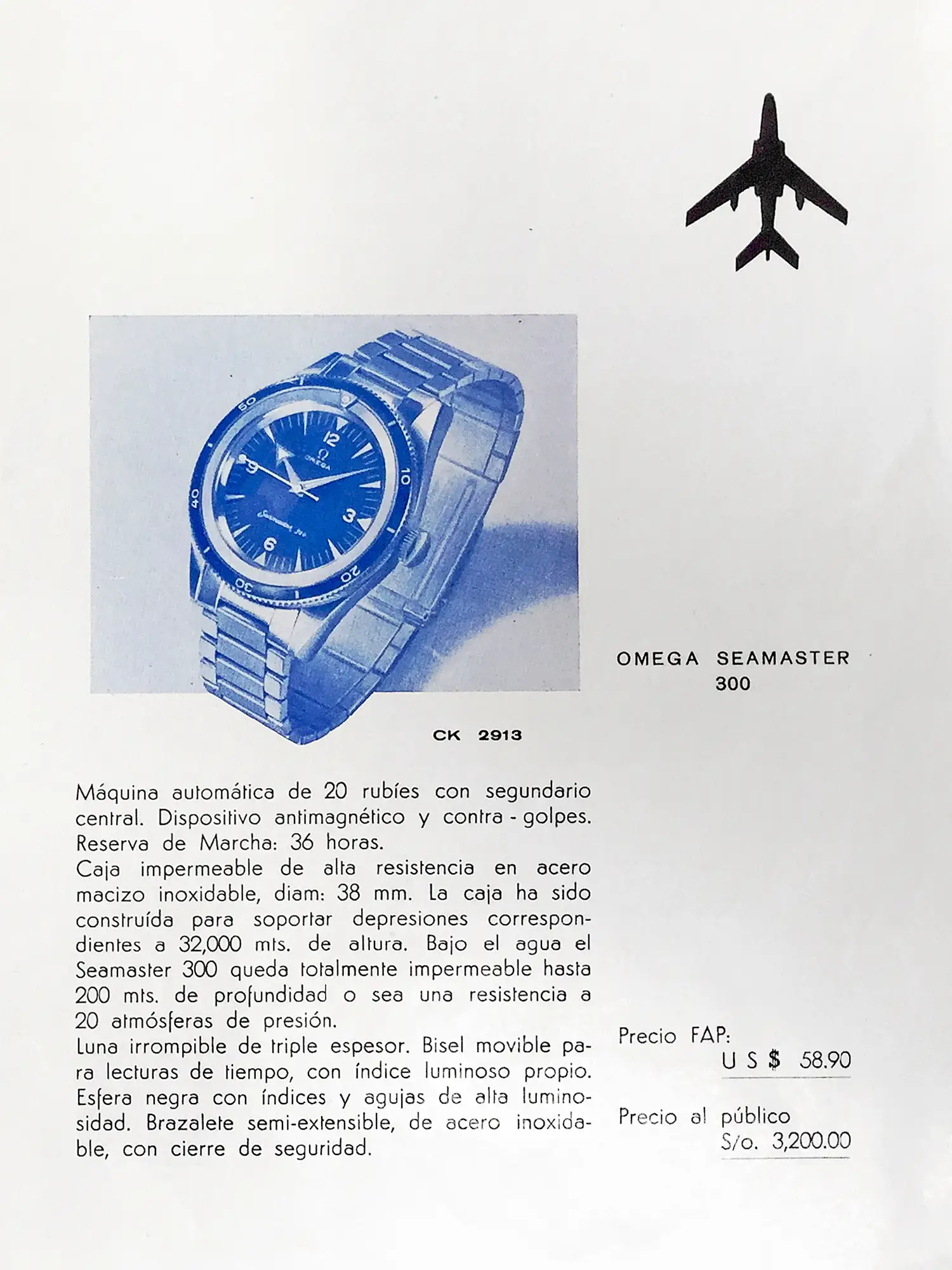 Description of the Seamaster 300 ref. CK 2913, showing the preferential FAP price of US $ 58,90. Note that the public price is indicated in local currency (sol de oro) and corresponded to US $ 237.