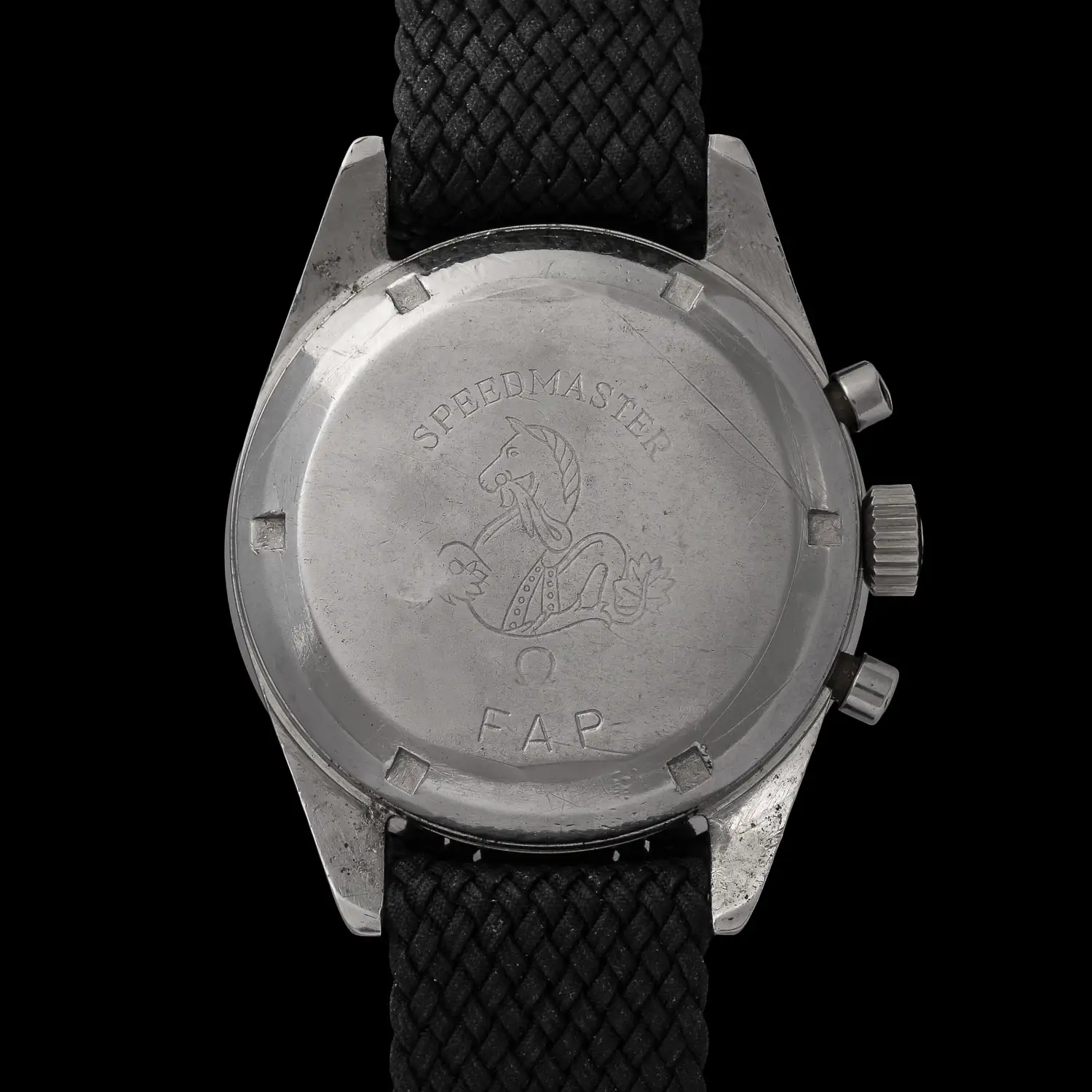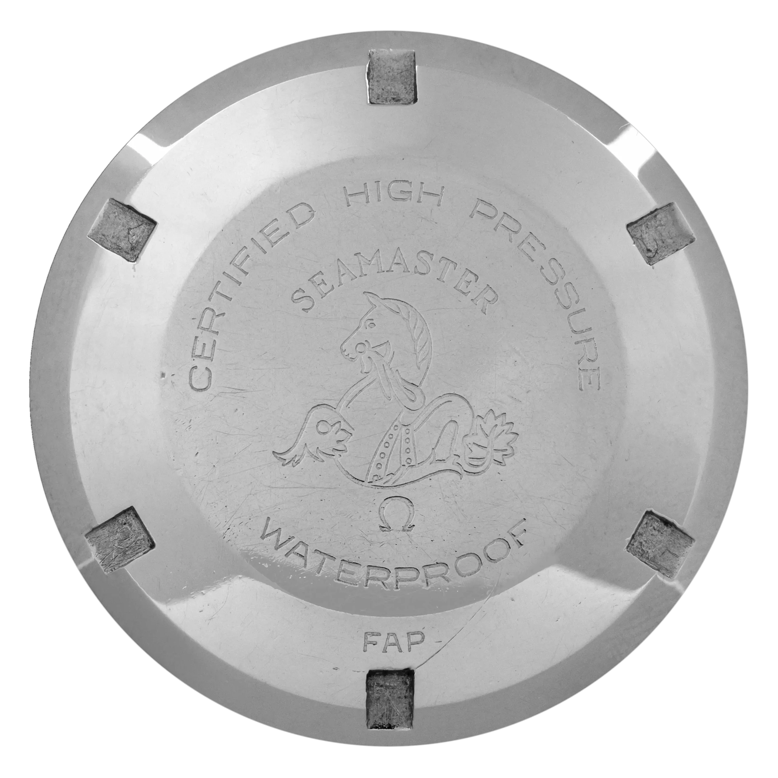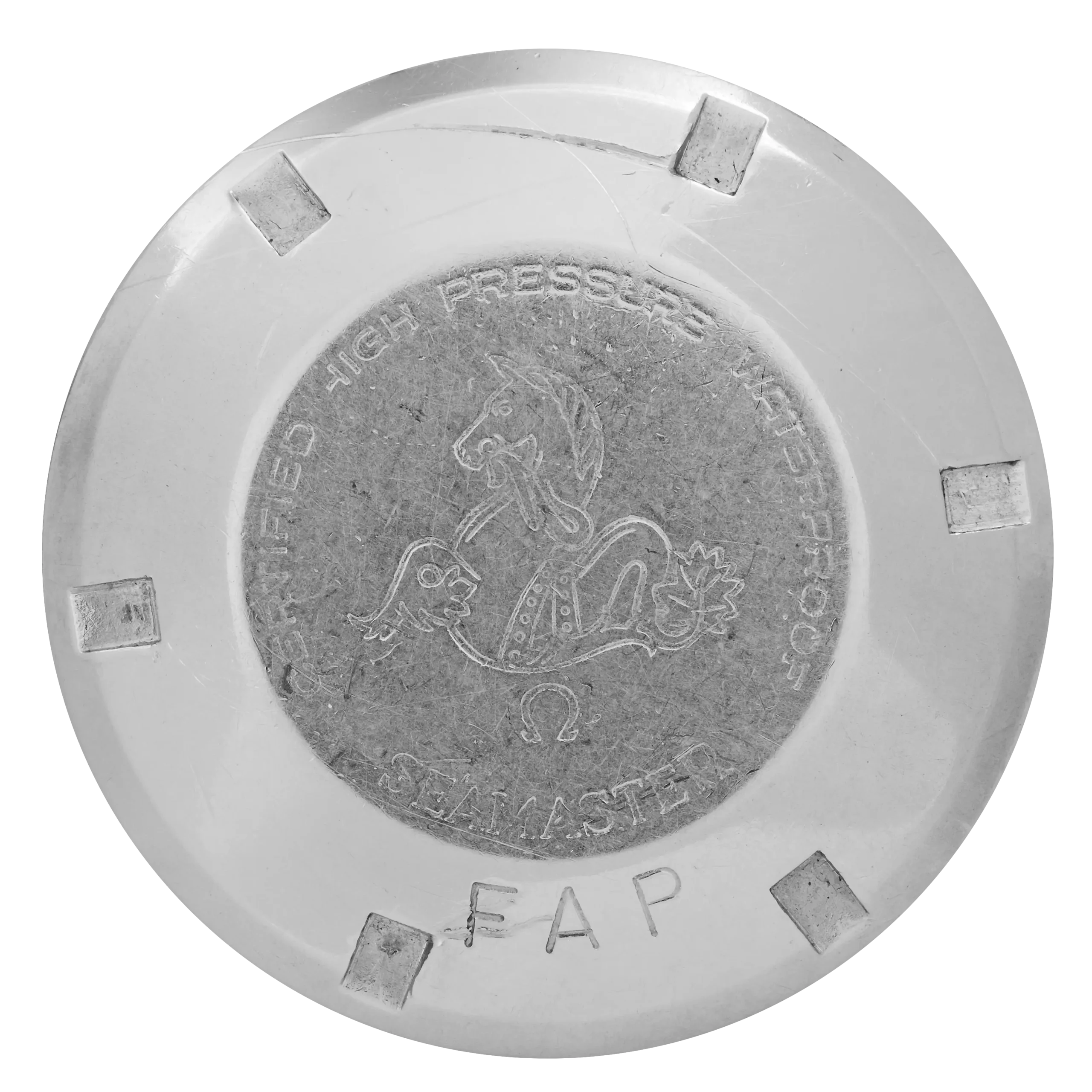 As mentioned in the brochure above, the outer casebacks were engraved with the acronym “FAP”, which was likely added locally after the watches left the OMEGA factory. The size, style and placement of this engraving vary from one version to another: