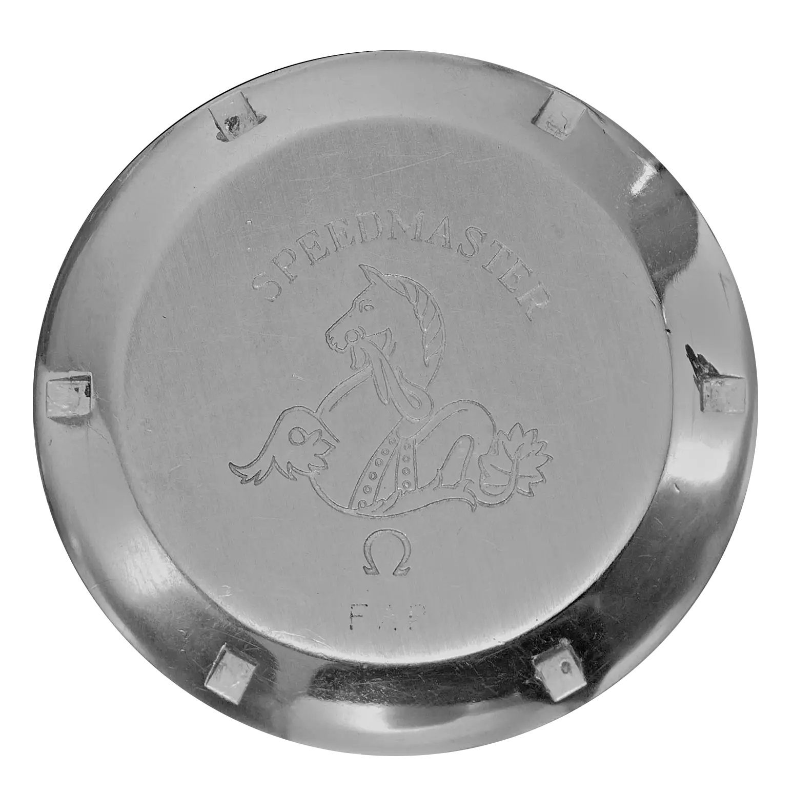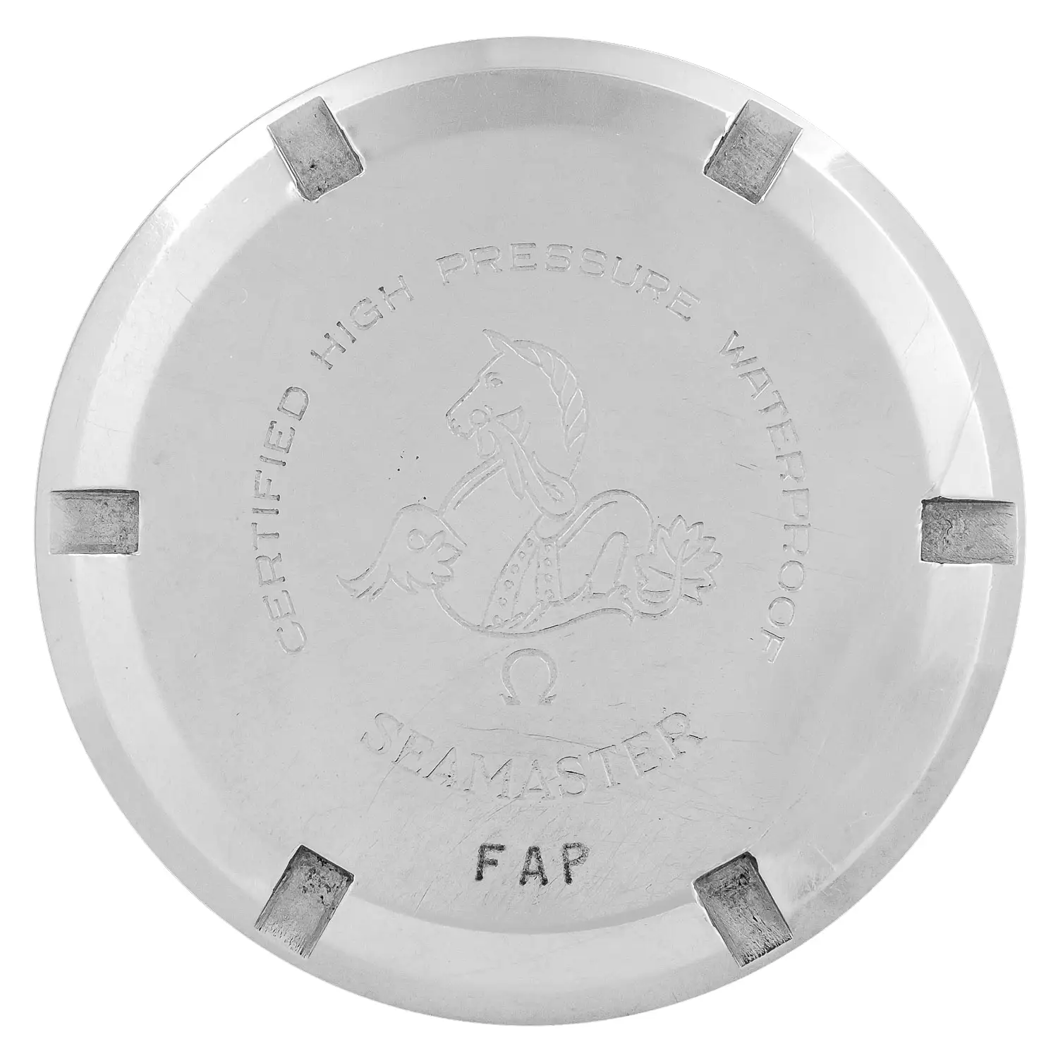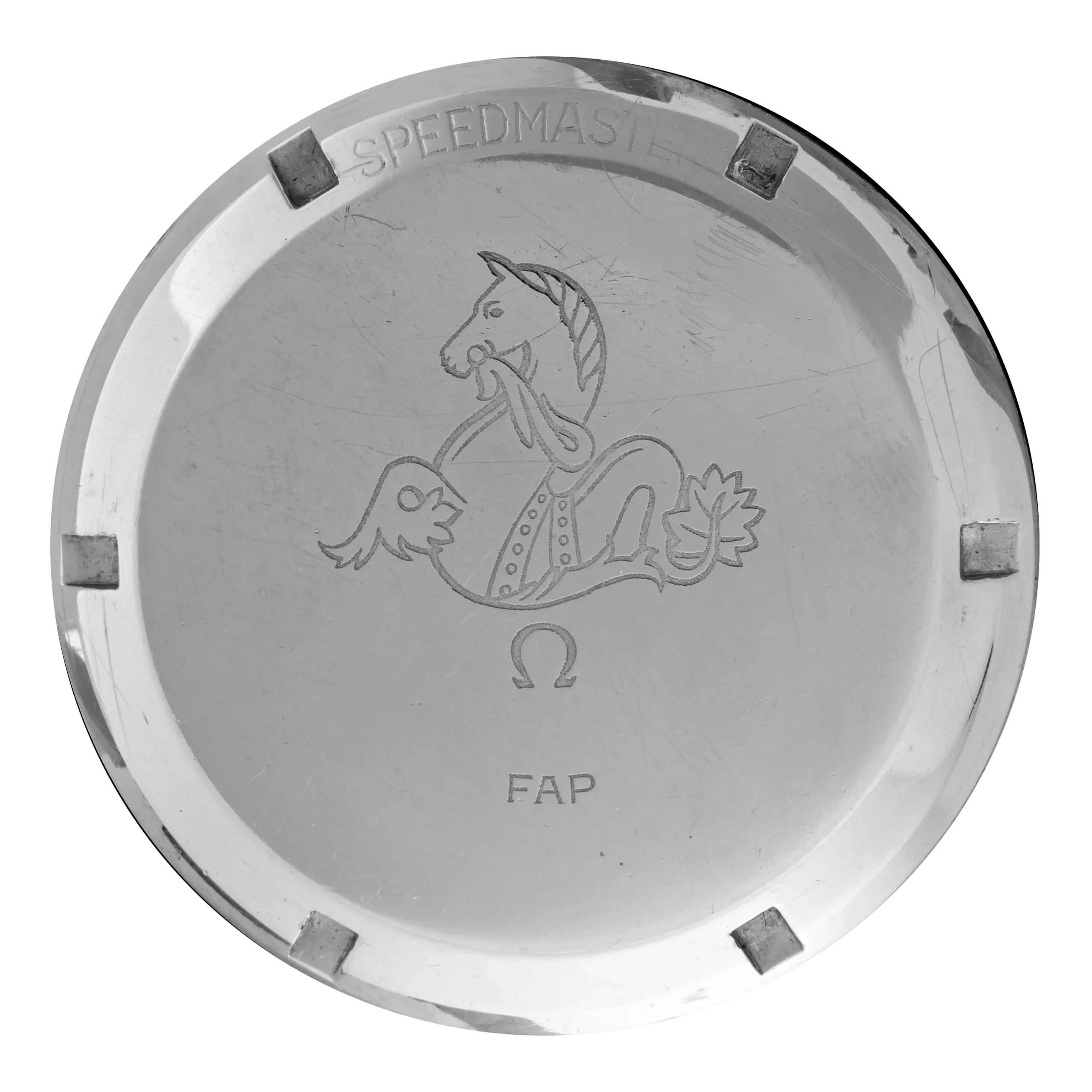 As mentioned in the brochure above, the outer casebacks were engraved with the acronym “FAP”, which was likely added locally after the watches left the OMEGA factory. The size, style and placement of this engraving vary from one version to another: