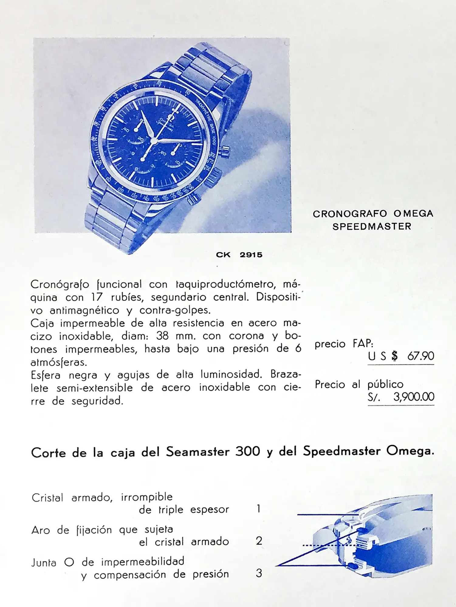 Presentation of the chronograph Speedmaster ref. CK 2915 (the model pictured is a 2915-3), showing the preferential FAP price of US $ 67,90. Note that the public price is indicated in local currency (sol de oro) and corresponded to US $ 289. The lower part of the page shows a drawing explaining the construction of the case and glass for the Seamaster 300 and Speedmaster, using o-rings to ensure waterproofness.
