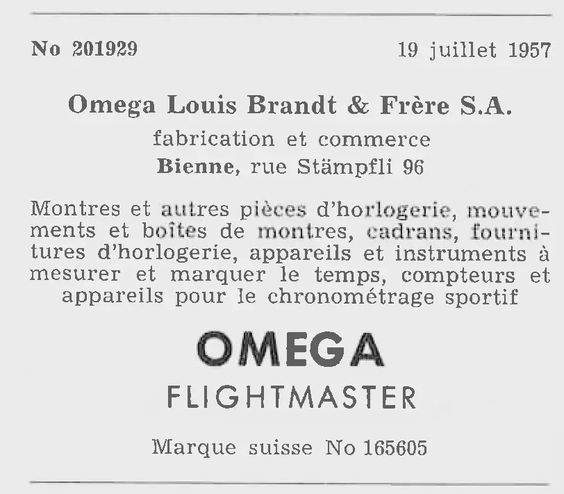 Publication of OMEGA’s trademark protection for the name “Flightmaster,” on 19 July 1957.