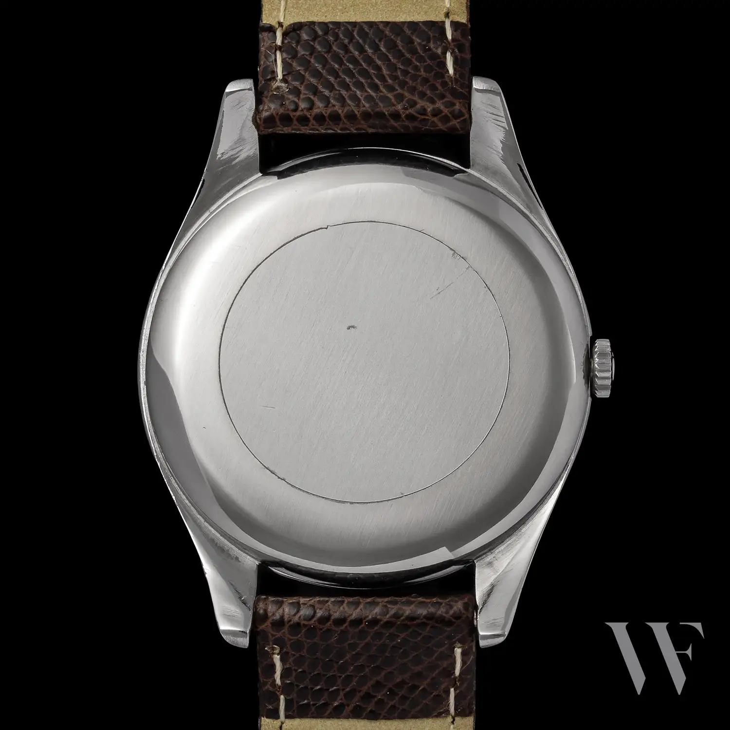 The reference features subsidiary seconds and was produced in a wide variety of dial styles, including sector and two-tone layouts. Its appeal lies in the combination of pre-war movement architecture with more modern oversize proportions.