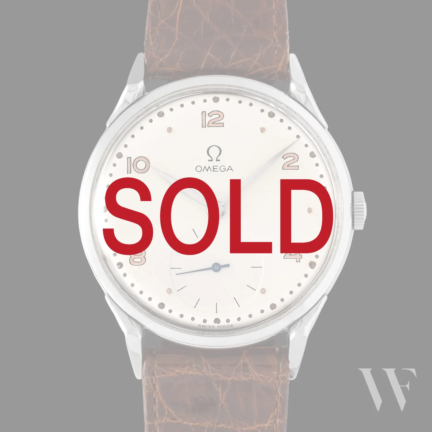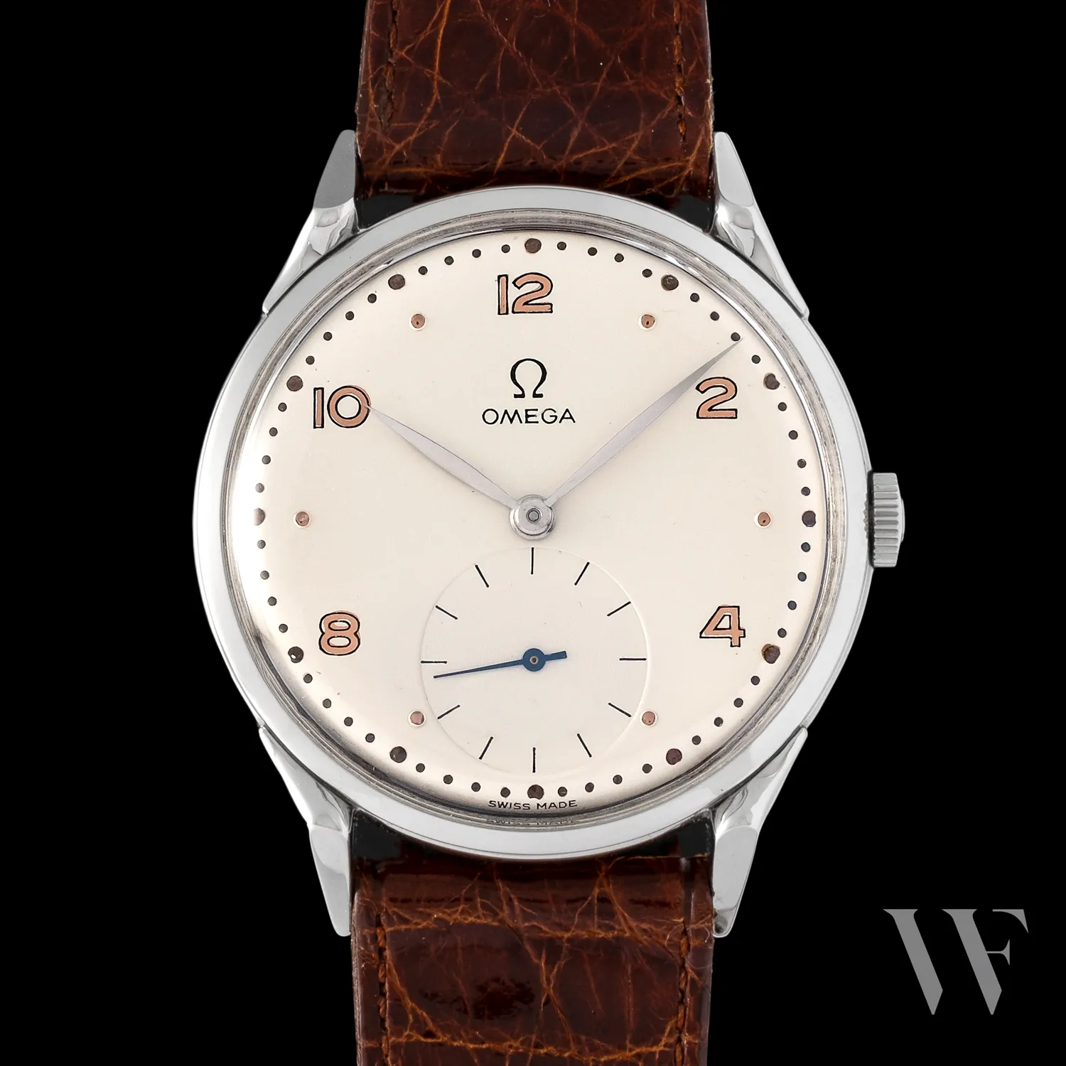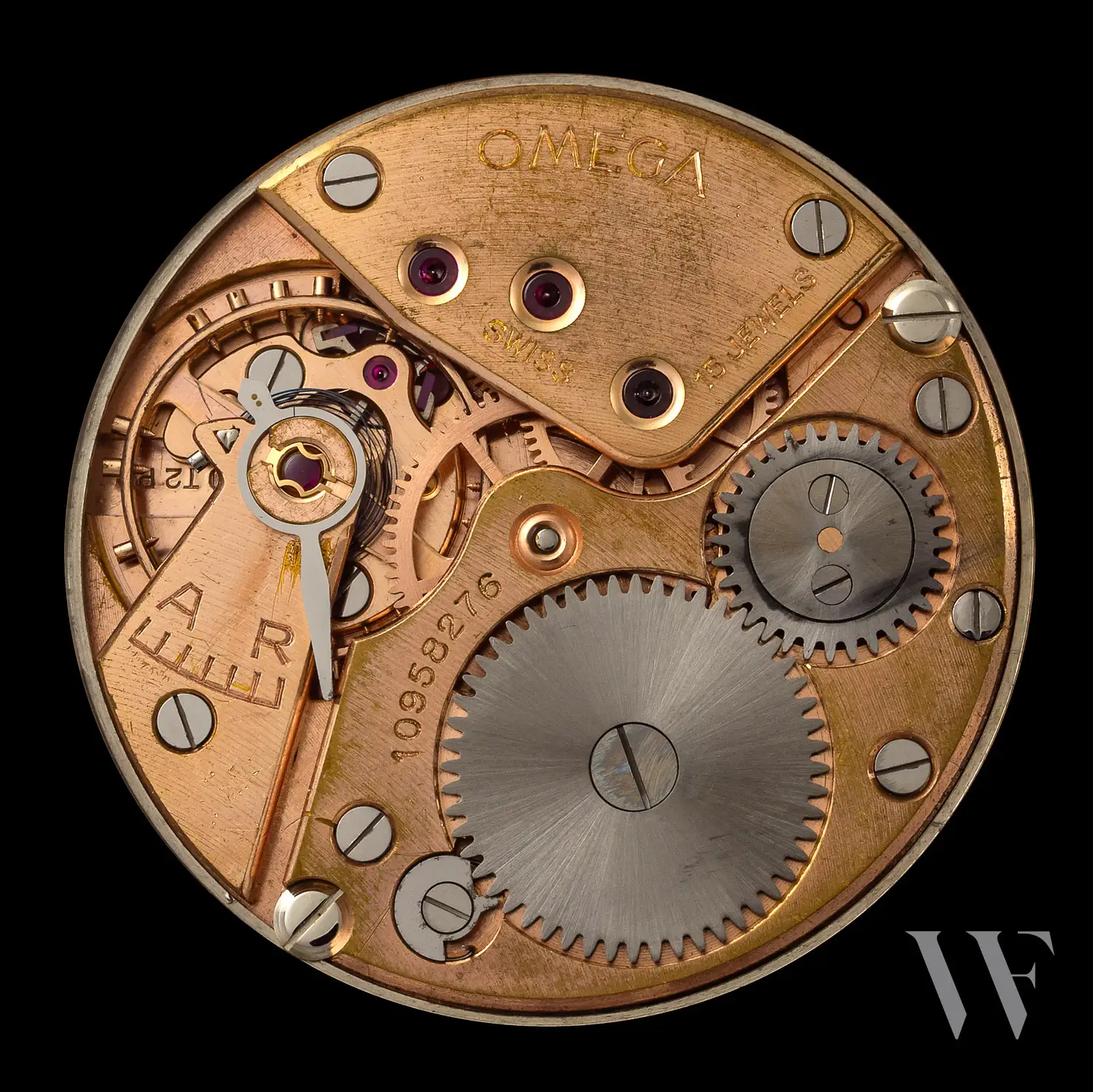 Like the other 2603 references, it belongs to Omega’s mid-1940s and early-1950s jumbo dress watches and is normally found with a hand-wound movement from the 30 mm family, here the 30T2.