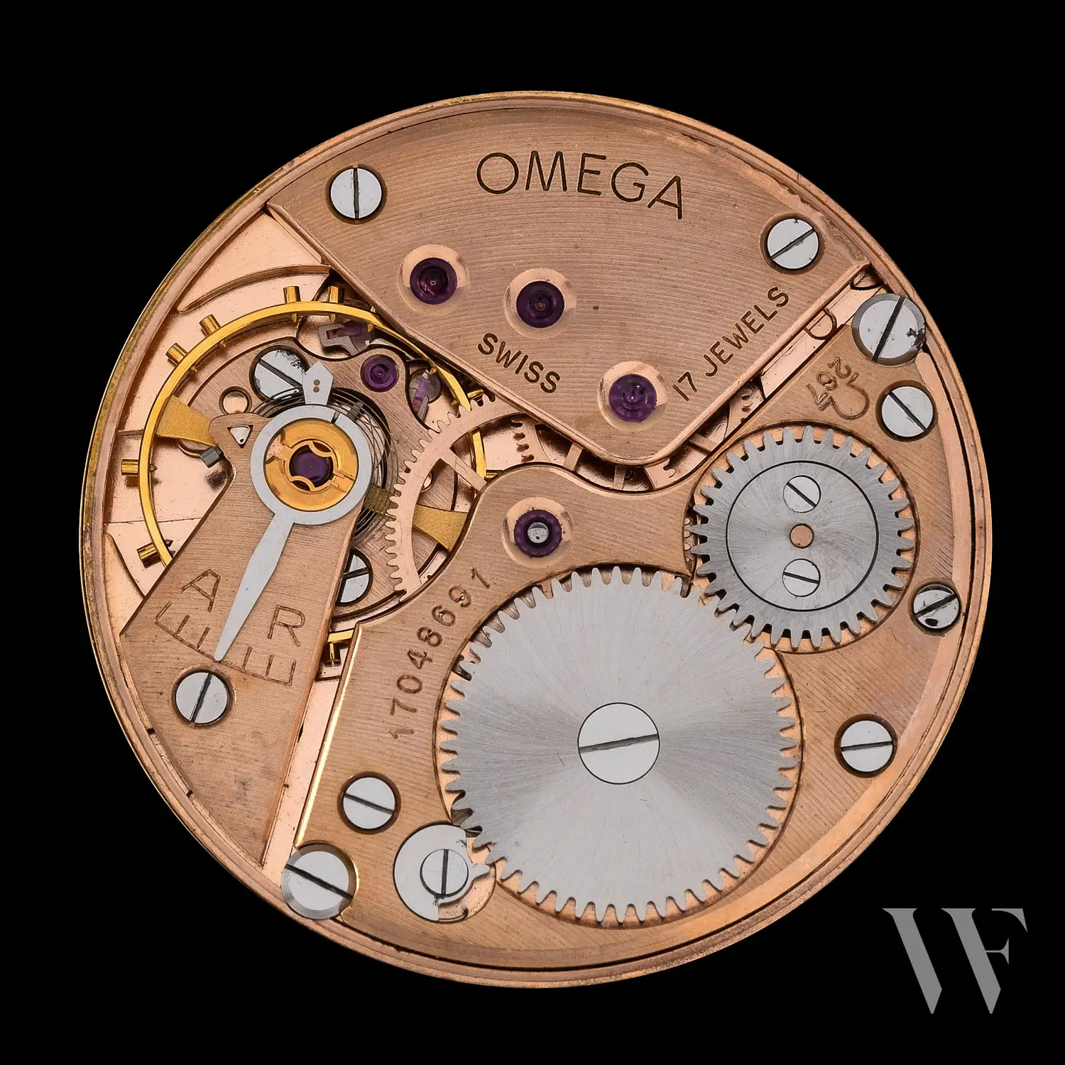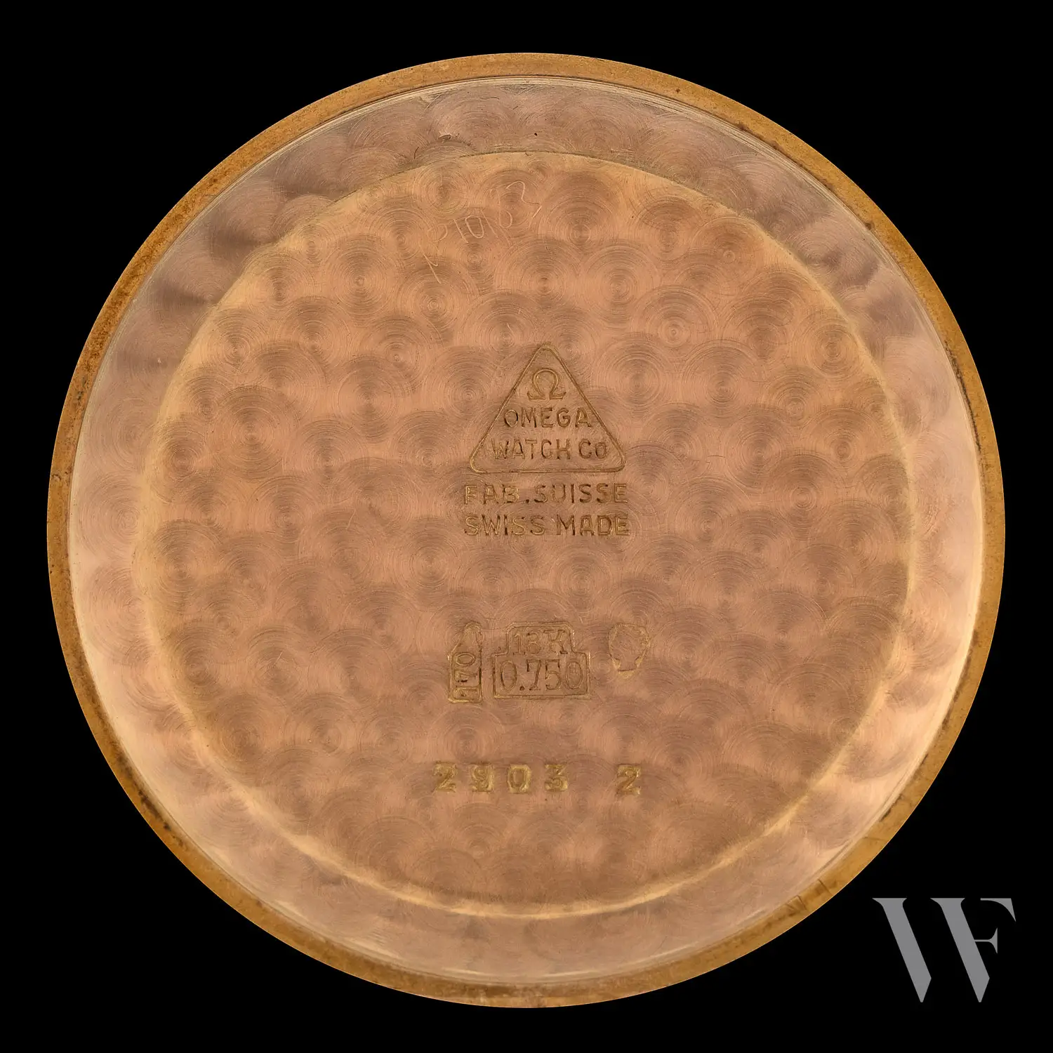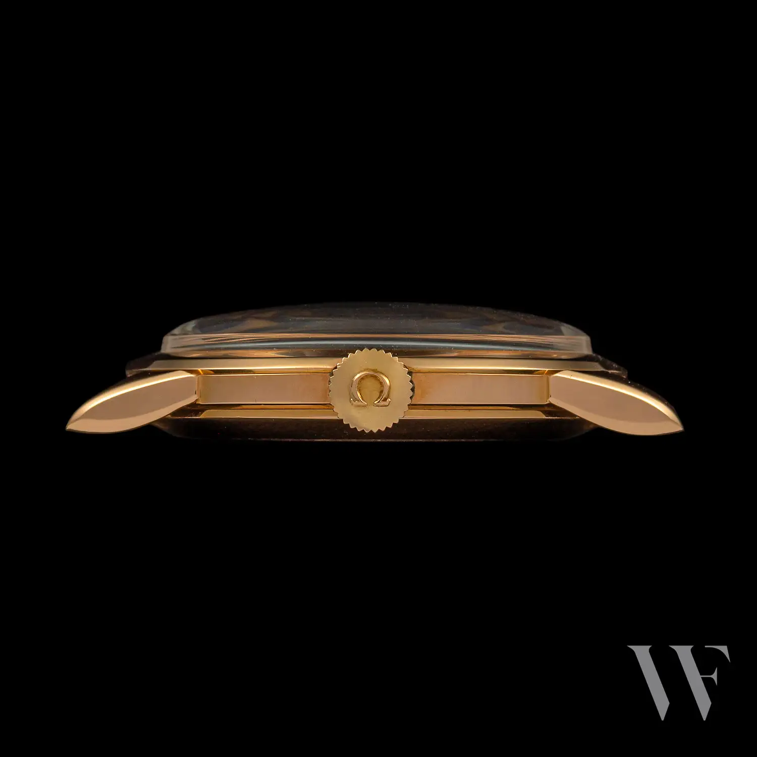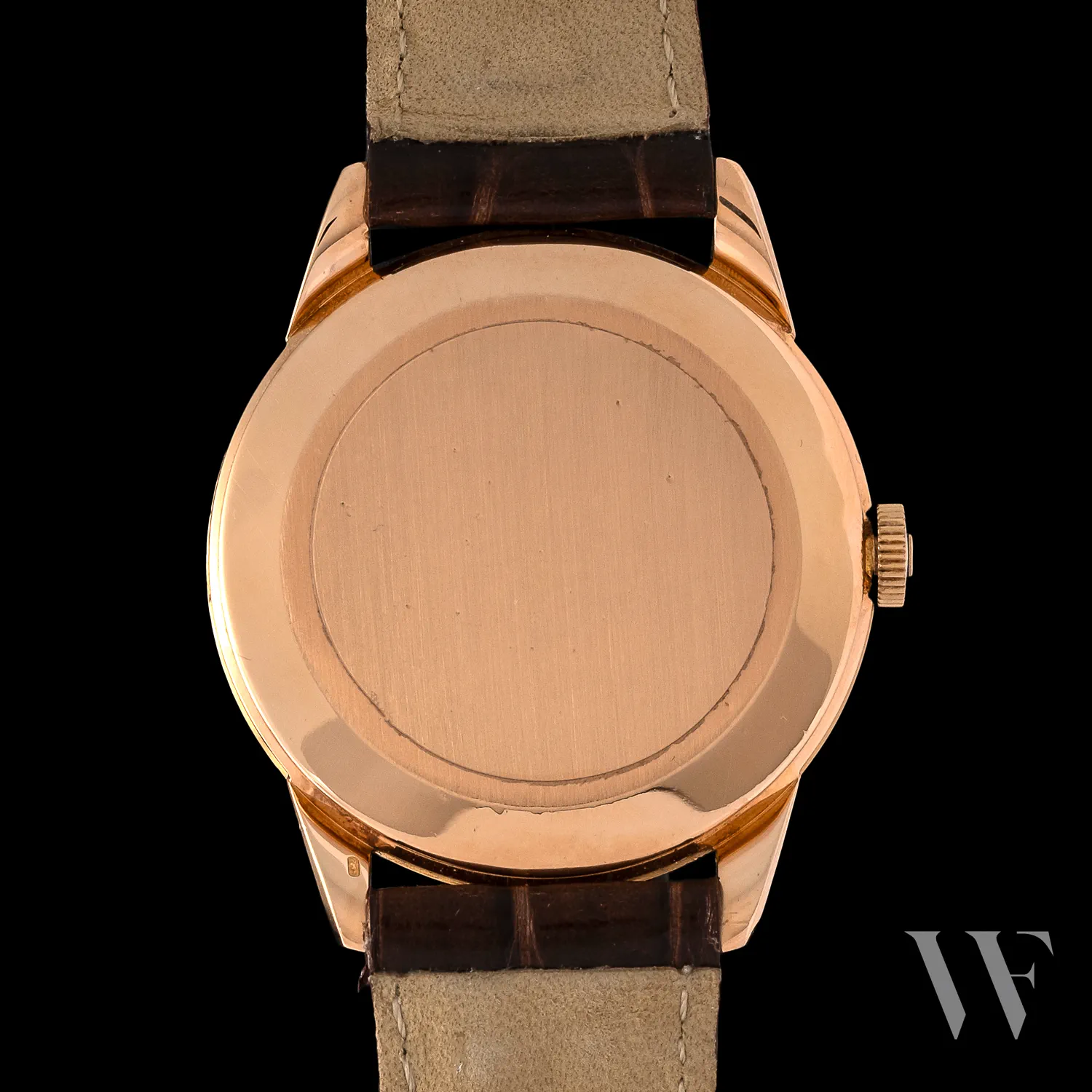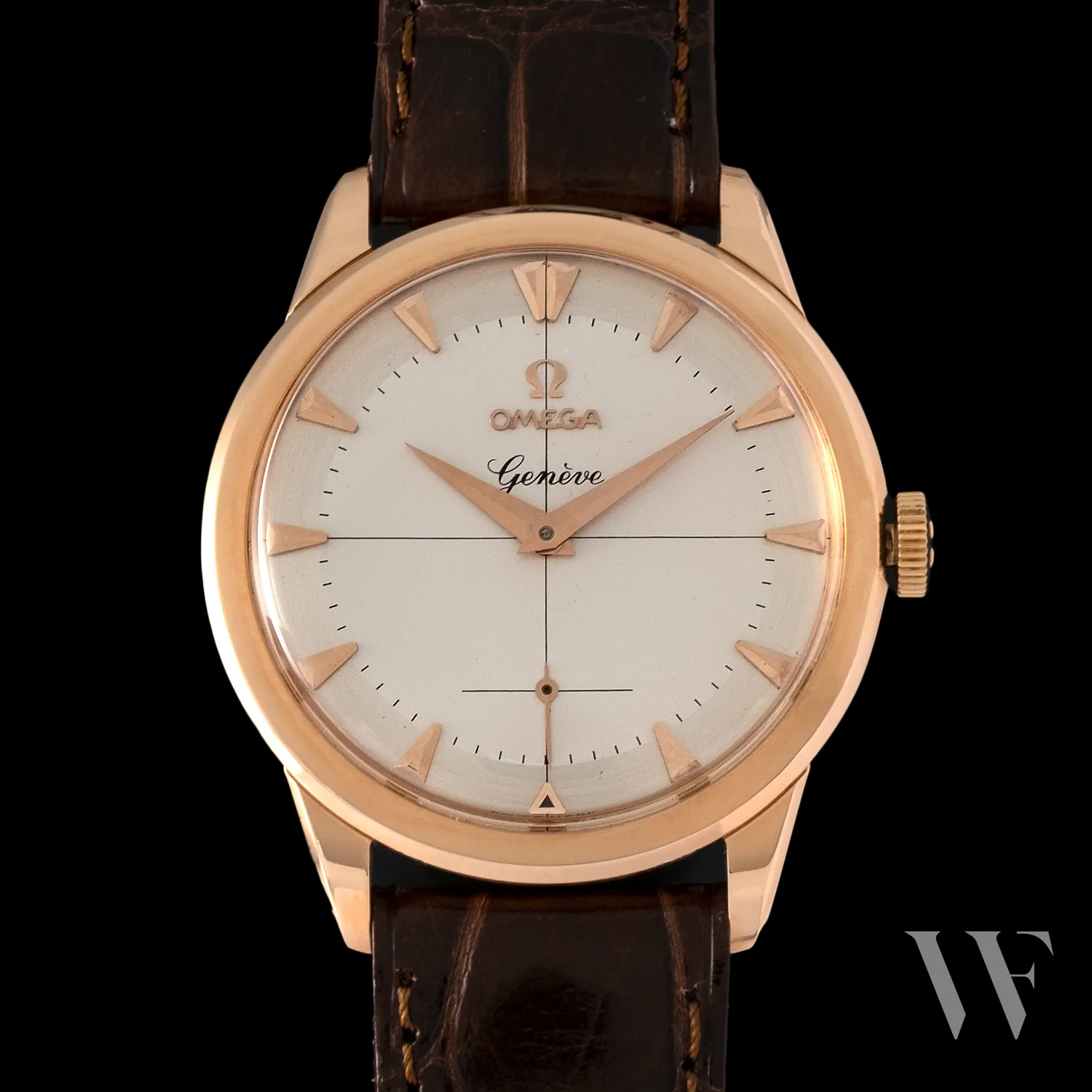 This rose gold example from 1953 is in outstanding condition and features a white dial with applied rose gold faceted arrow-shaped indexes, along with the Omega name and logo. The word “Genève” appears printed in a black cursive script.