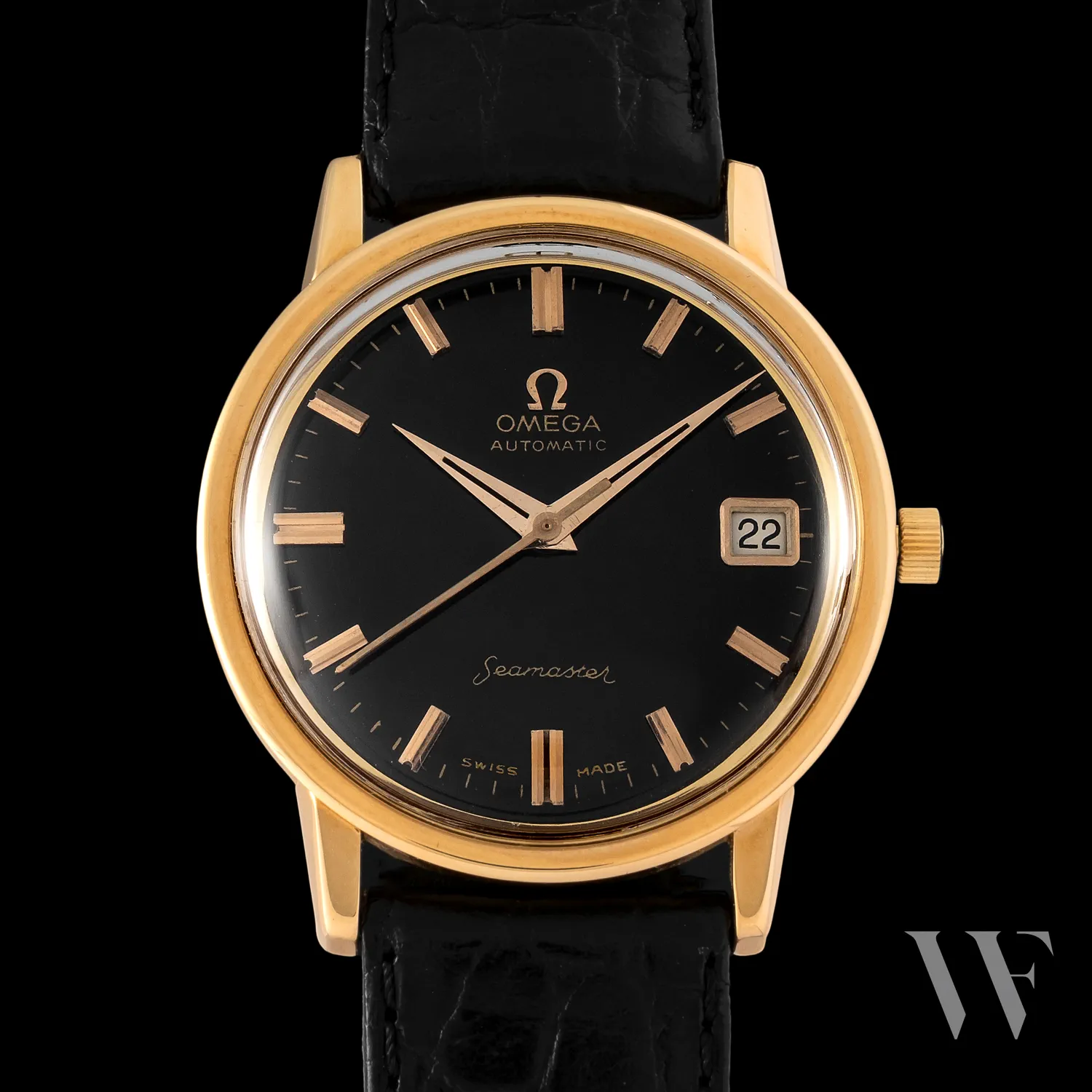 Measuring approximately 34.5 mm, with central seconds and a classic date display at 3 o’clock, this reference represents one of Omega’s archetypal dress-oriented Seamasters of the period.