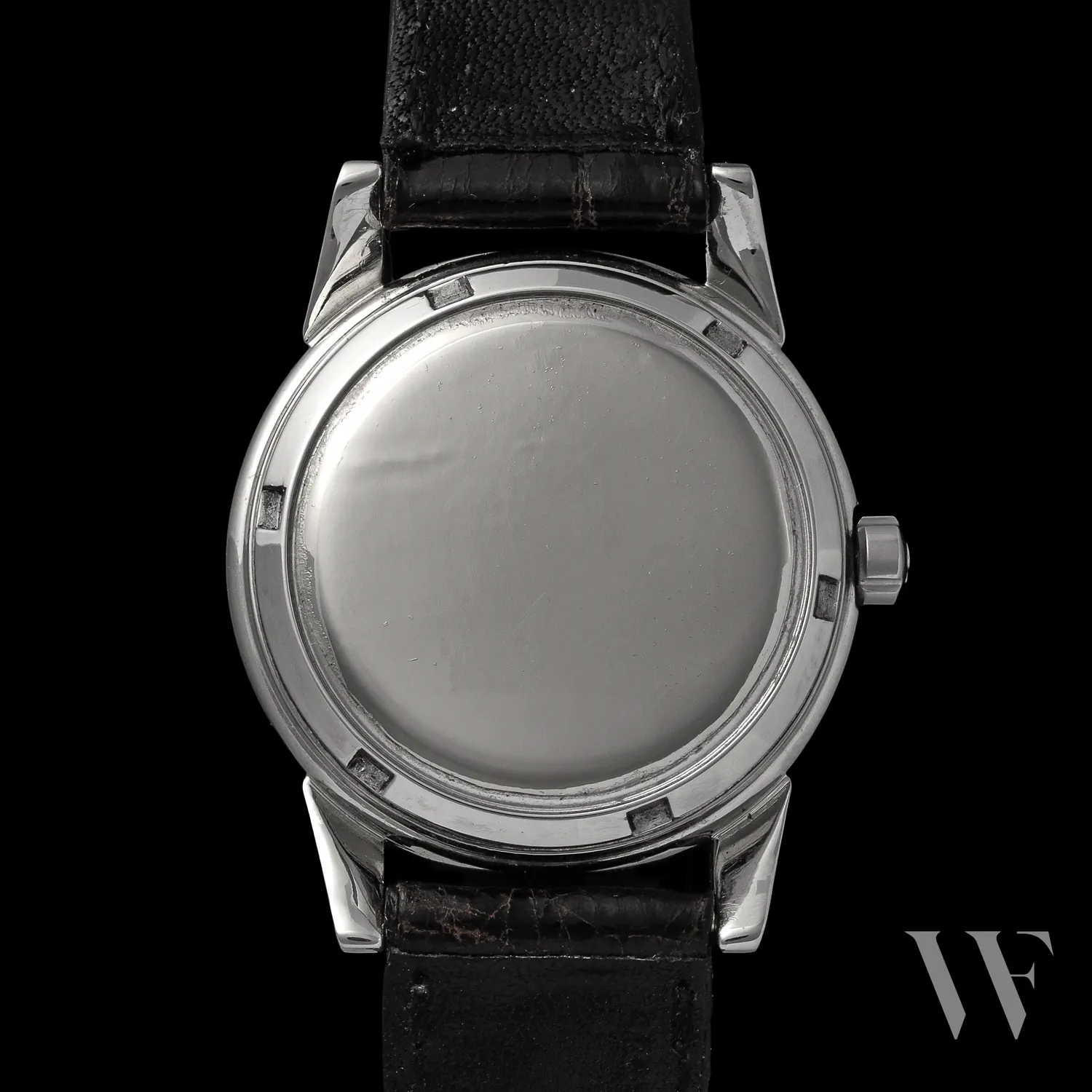 The present example stands out for its glossy black dial with applied arrow-shaped indexes.