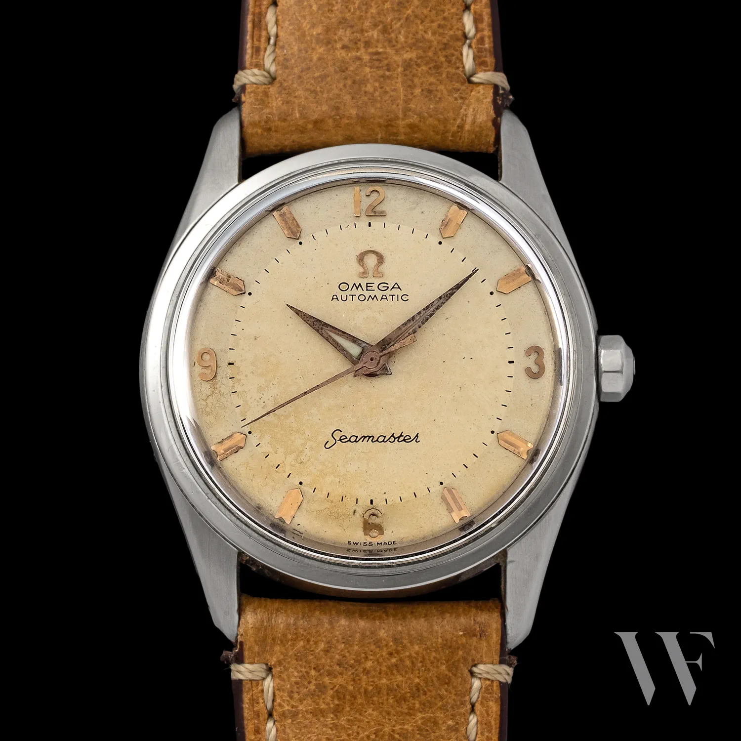 The model represents the Seamaster line in its elegant daily-wear phase, prior to the more angular designs and quick-set date calibers introduced in the 1960s.