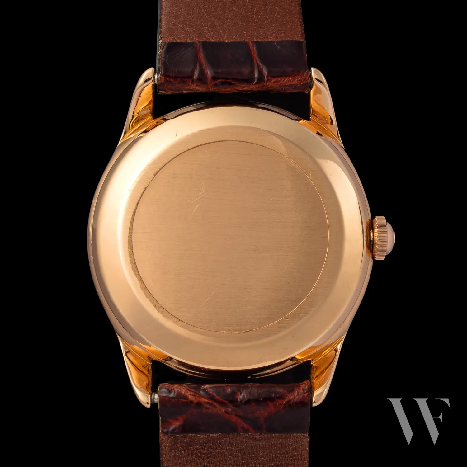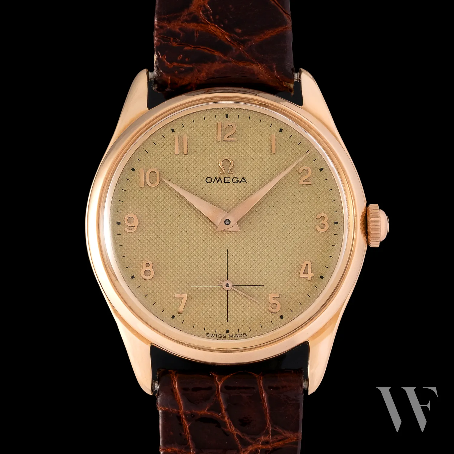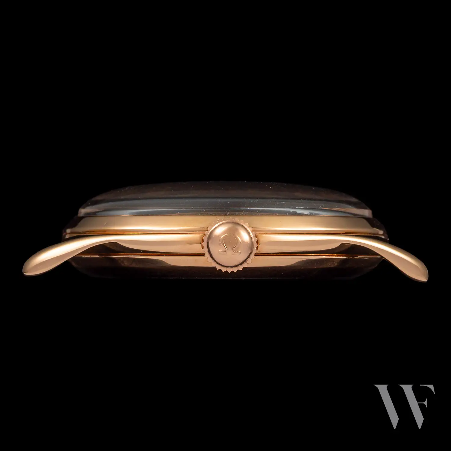 Measuring approximately 36 mm in diameter and powered by the caliber 265, the present example is housed in a rose gold case and features a very attractive champagne-toned honeycomb dial with applied rose gold Arabic numerals and Omega logo, complemented by matching rose gold Dauphine hour and minute hands.